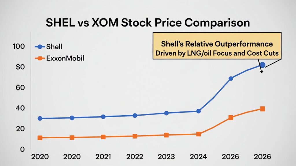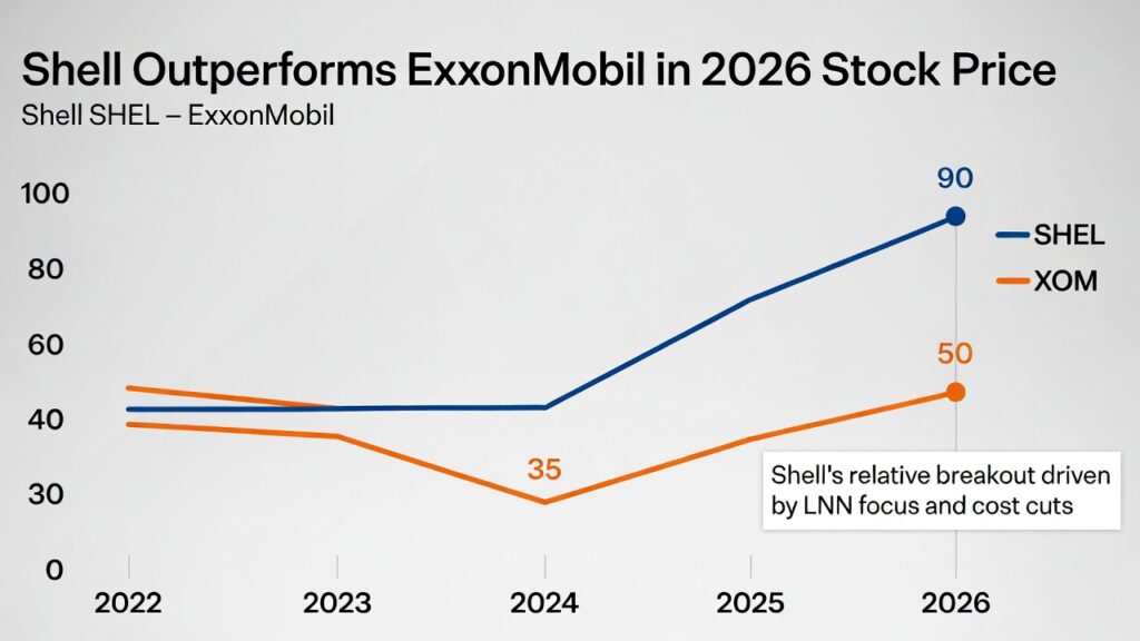 (image: Dual line chart showing SHEL and XOM stock prices, highlighting Shell’s relative breakout in 2026 on LNG/oil focus and cost cuts.)