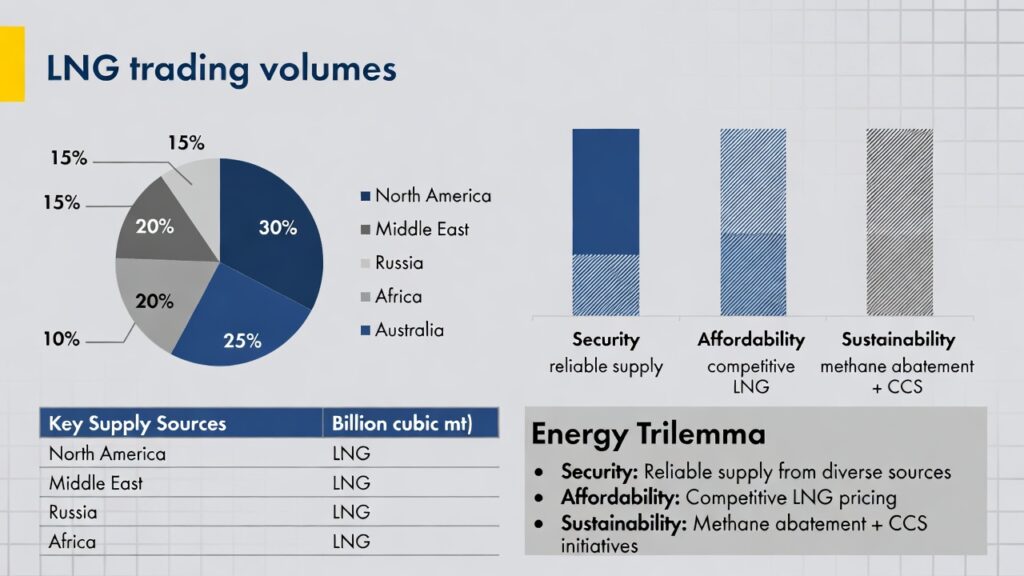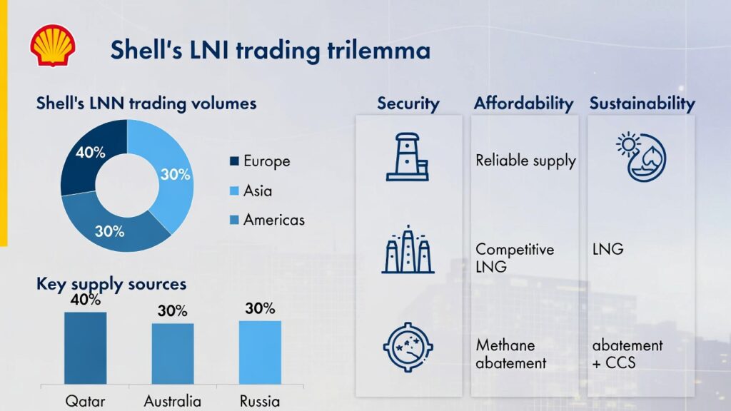 ( image: Pie chart or infographic showing Shell’s LNG trading volumes, key supply sources, and trilemma pillars: security (reliable supply), affordability (competitive LNG), sustainability (methane abatement + CCS).)