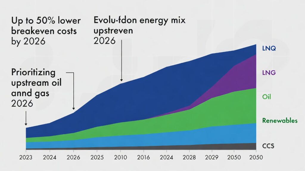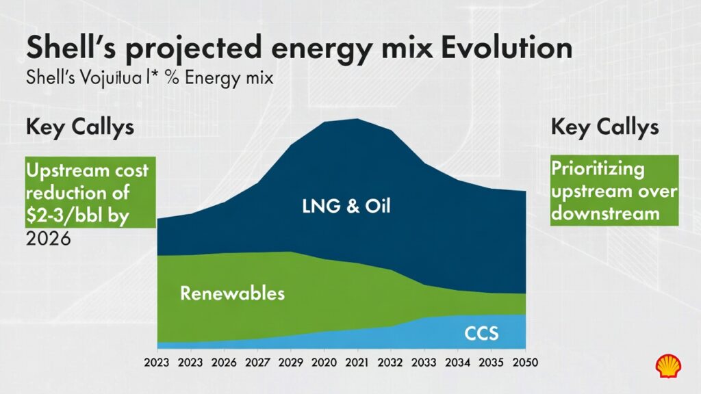 (image: Stacked bar or area chart showing Shell’s projected energy mix evolution: LNG/oil growth, renewables slowdown, CCS ramp-up, with callouts for 2026 cost cuts and upstream prioritization.)