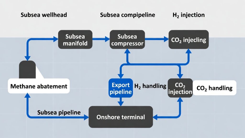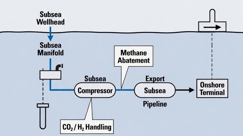( image: Diagram showing subsea well → manifold → subsea compressor → export pipeline → onshore terminal or CCS injection, with callouts for methane abatement and CO₂/H₂ handling.)