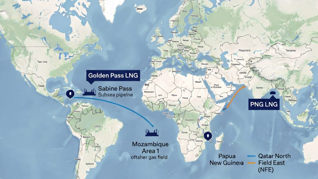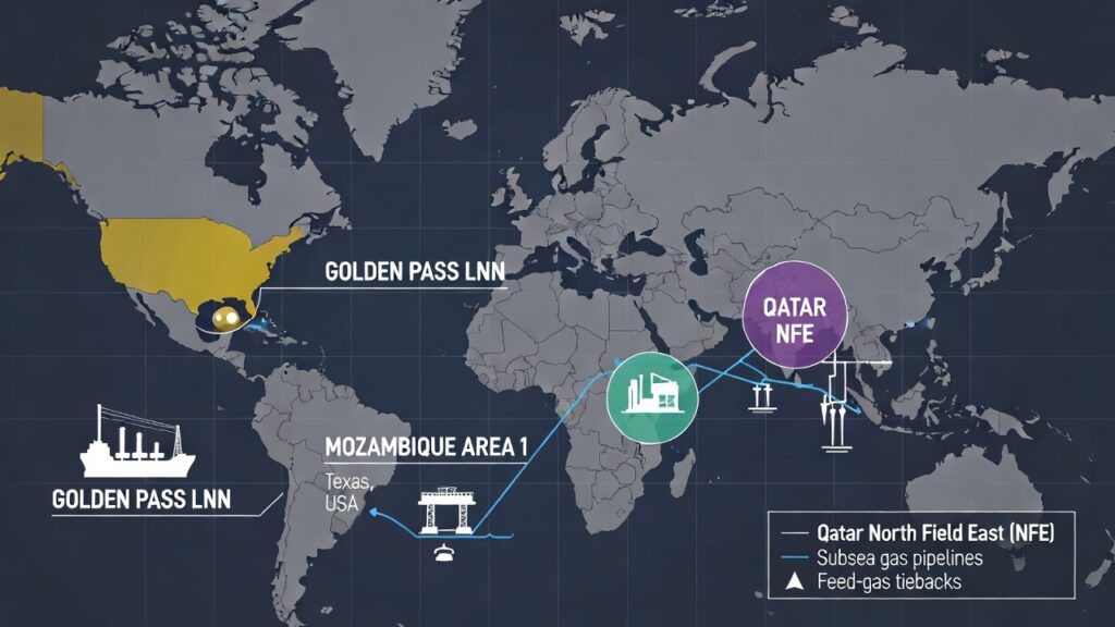 ( image: World map highlighting Golden Pass, PNG LNG, Mozambique Area 1, Qatar NFE, with subsea pipeline icons for feed-gas tiebacks.)
