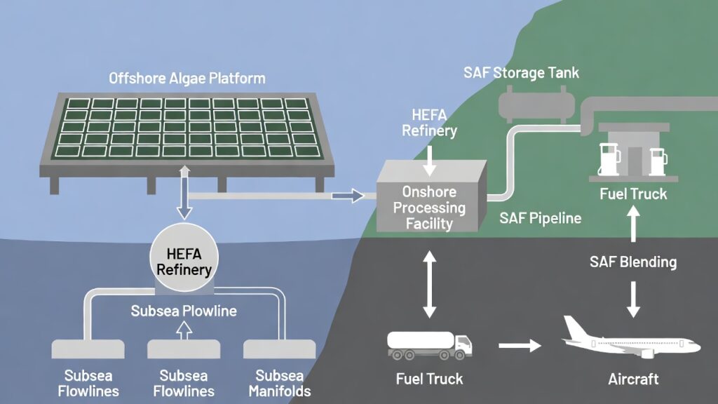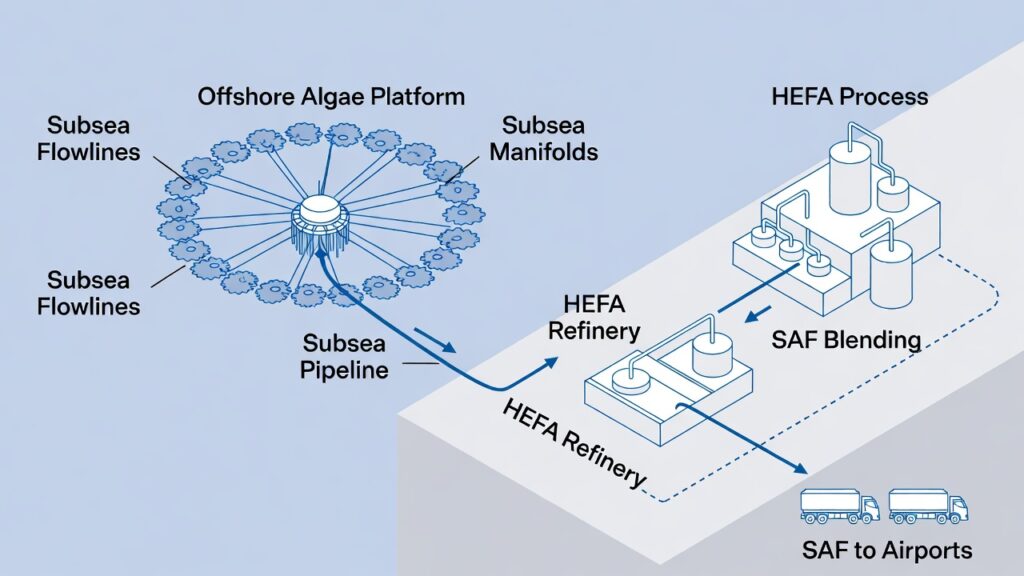( image: Flow diagram showing offshore algae platform → subsea pipeline → onshore HEFA refinery → SAF blending → airports, with callouts for subsea flow lines and manifolds.)