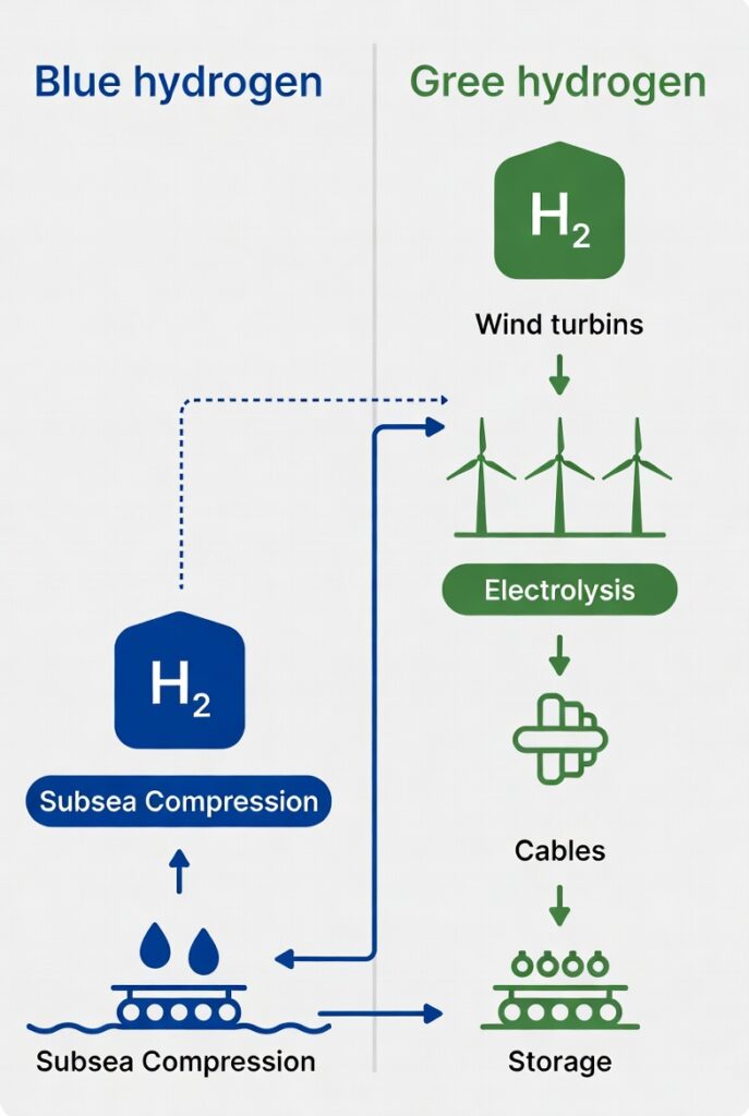 ( image: Schematic showing blue H₂ (gas + CCS) and green H₂ (wind electrolysis), with subsea compression, cables, and storage callouts.)