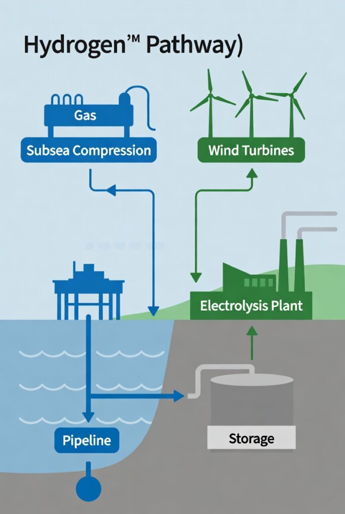 - Subsea role: Subsea compression for H₂ export, subsea cables for offshore electrolysis power, and injection wells for underground storage.