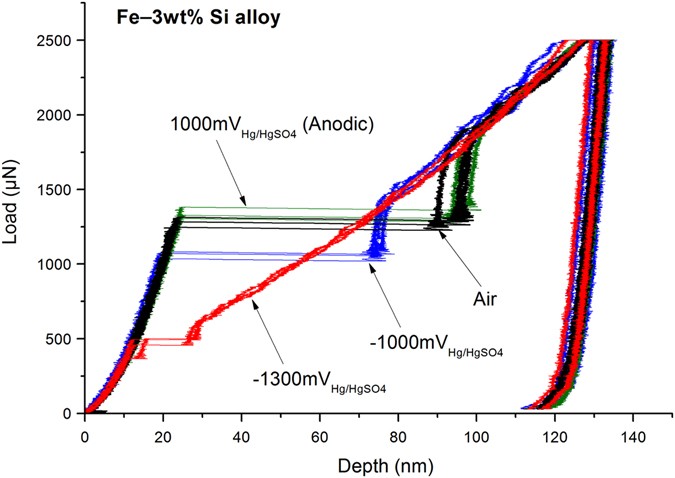 Figure 1: Load vs Depth Profile for Fe-3wt% Si Alloy in HPHT Conditions