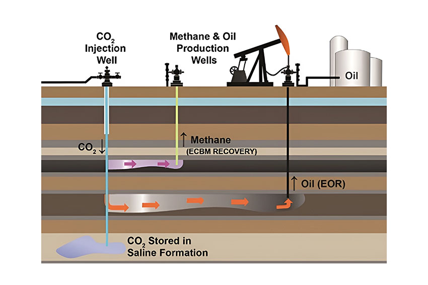 This schematic shows CO₂ injection, methane/oil production, and storage in saline formations. Notice the metallurgy demands on injection wells — CRAs like 13Cr or Inconel are essential to prevent corrosion in these mixed environments.