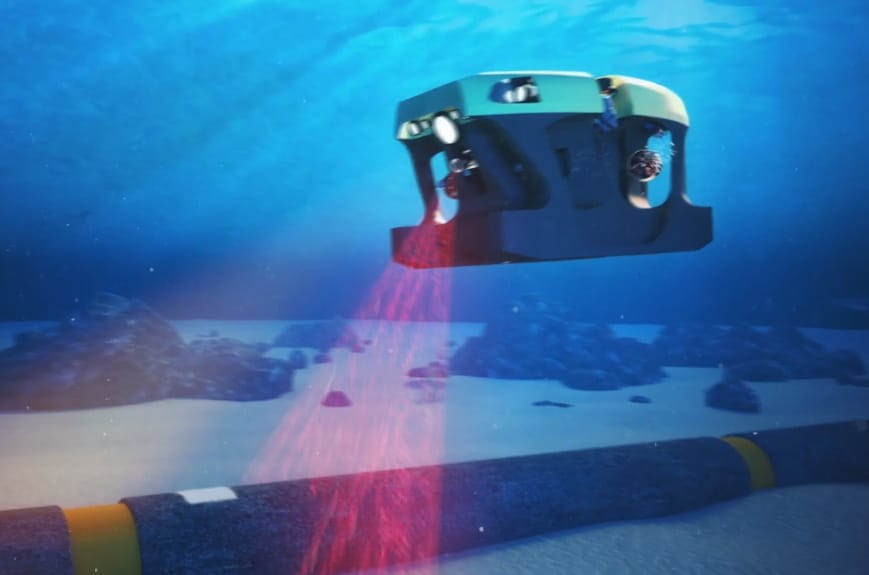 Advanced AUV equipped with laser and sonar scanning a subsea pipeline—highlighting precise detection of features like burial status and anomalies.