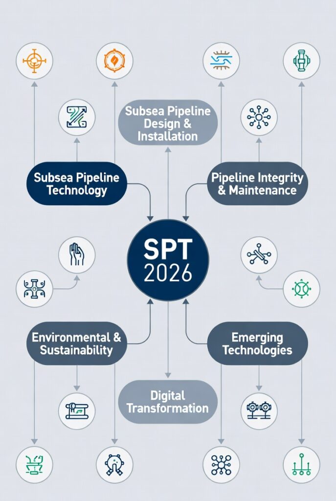 “Mind-map of SPT 2026 key themes: Showing how core topics like pipeline integrity, installation innovations, lifecycle management, and energy transition repurposing interconnect within the broader subsea pipeline ecosystem.”