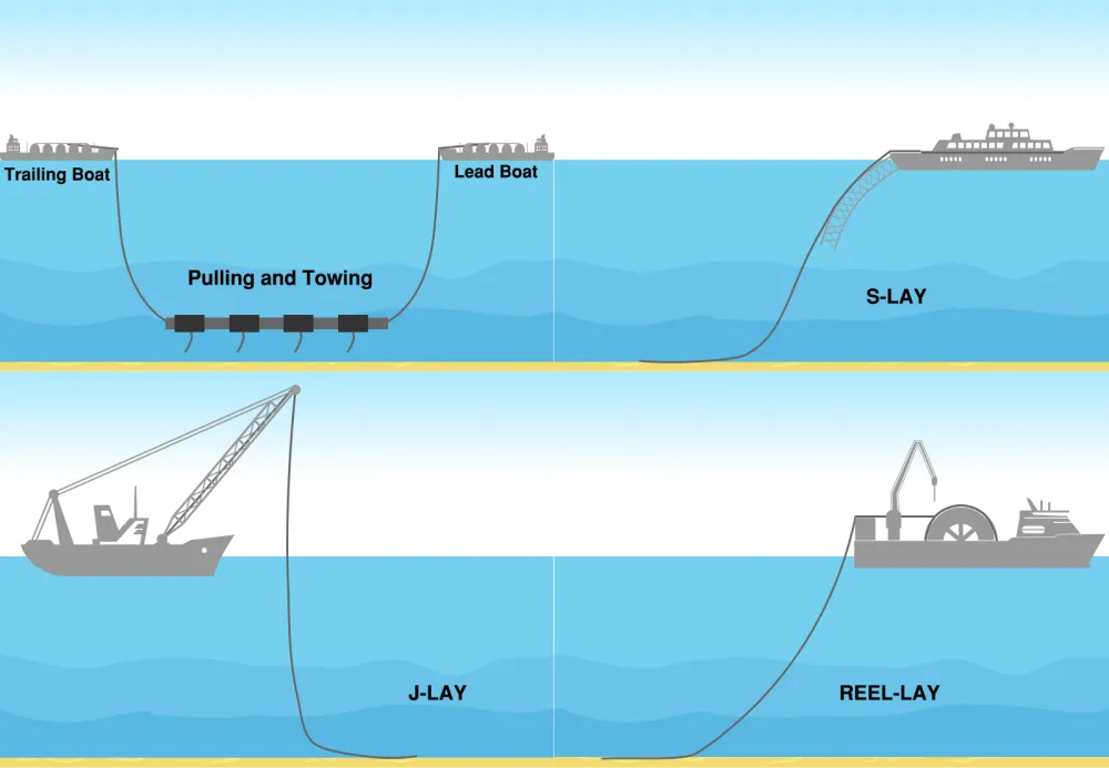 Innovation is the heartbeat of offshore pipelines in 2026. At the forefront are advancements in integrity management, like real-time subsea inspections using tools that skip coating removal, and digital twins for simulating CO2 and H2 flows. The Offshore Technology Conference (OTC) 2026 is spotlighting how oil and gas tech integrates with renewables, such as offshore wind and tidal energy, to drive sustainable solutions. A big theme at the Subsea Pipeline Technology Congress (SPT 2026) and Pipeline Technology Conference (ptc 2026) is repurposing existing pipelines for the energy transition—think hydrogen, CO2, and even ammonia transport. Hydrogen pipelines are heating up, with a focus on leak minimization to maximize climate benefits. Meanwhile, ROVs and AUVs are evolving for deeper, more efficient monitoring in ultra-deepwater environments.Check out this diagram illustrating subsea pipeline installation methods, crucial for these innovative projects: