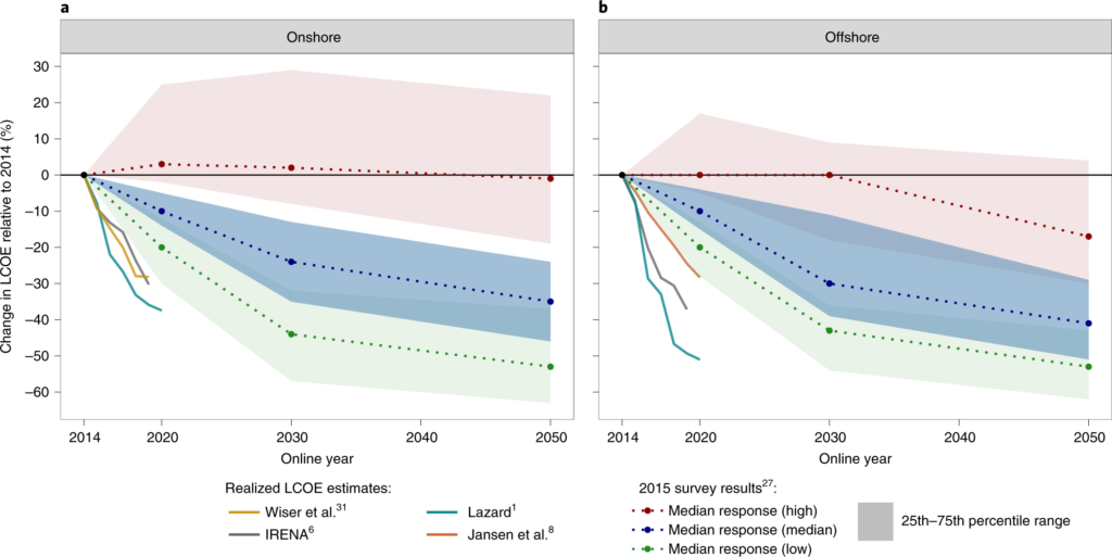 Here is a representative graph from expert elicitation surveys illustrating projected LCOE trajectories for offshore wind: