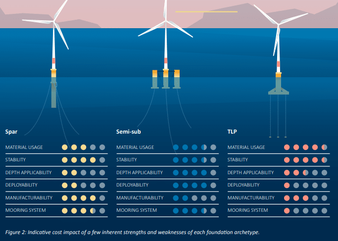 Floating platforms must provide sufficient buoyancy, stability against wave/wind loading, and station-keeping via mooring systems, while minimizing motion to maintain turbine performance.The three primary floating foundation archetypes are: