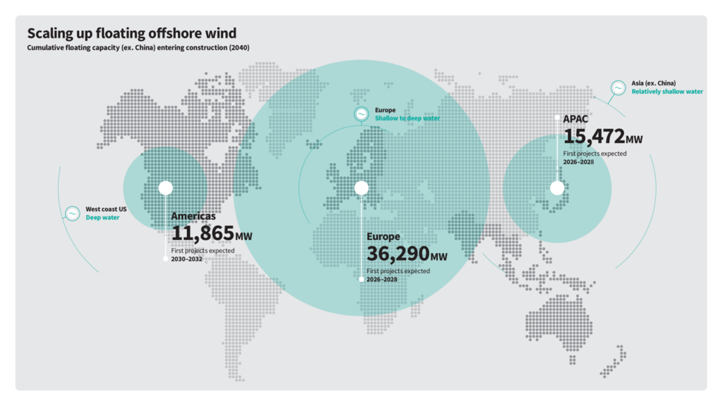 Notable 2026 milestones include Japan’s Goto project (first commercial hybrid SPAR farm), UK’s Green Volt (pioneering 400–560 MW array), and port developments on the US West Coast.