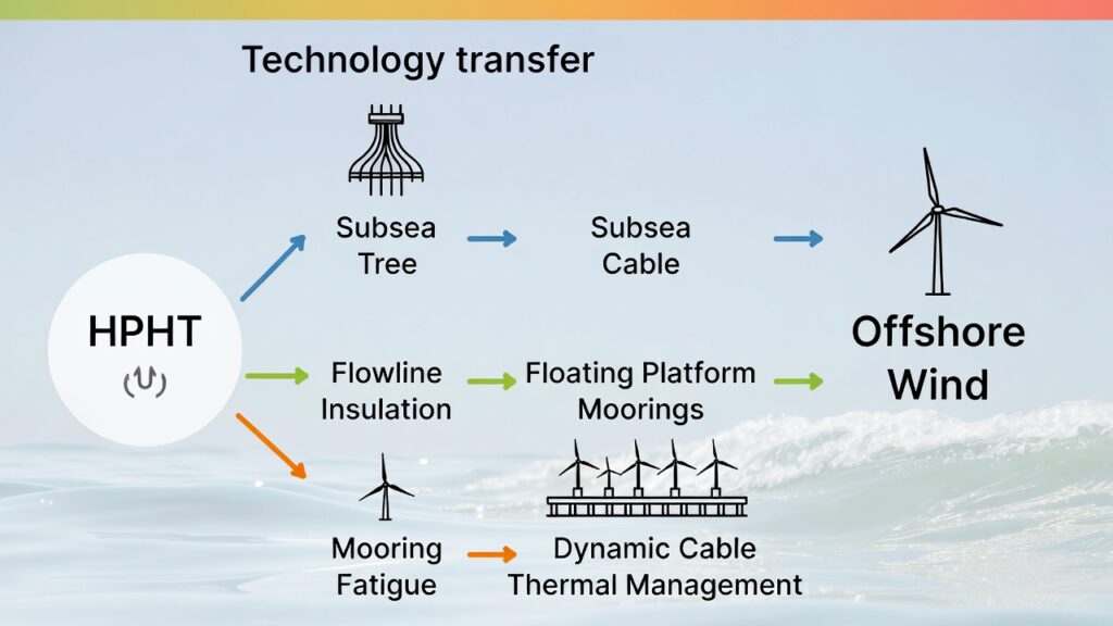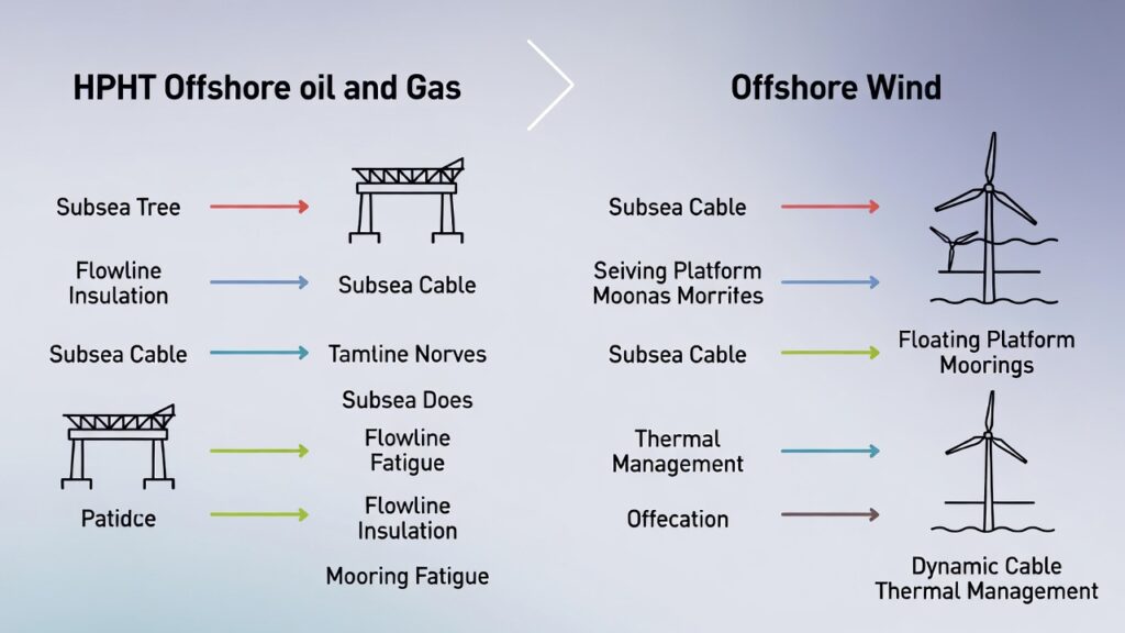 (Insert image: Diagram showing HPHT elements (subsea tree, flowline insulation, mooring fatigue) linked to wind equivalents (subsea cable, floating platform moorings, dynamic cable thermal management). Color-coded arrows for tech transfer.)
