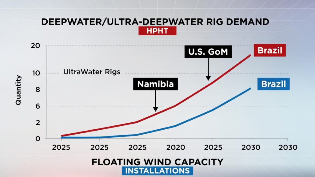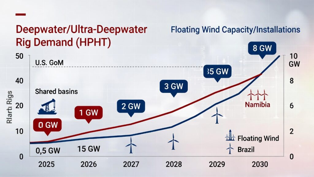 (Insert image: Line chart showing rising deepwater/ultra-deepwater rig demand (HPHT) alongside increasing floating wind capacity/installations in 2025–2030, with callouts for shared basins like U.S. GoM, Namibia, Brazil.)