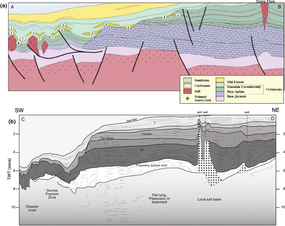 Central Atlantic margin geological cross-section, illustrating typical conjugate structures, source rocks, reservoirs, and traps shared between the African and South American Equatorial Margins.