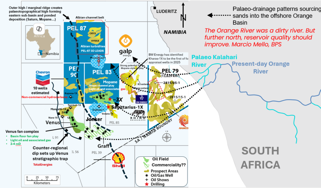 Detailed Orange Basin prospect and discovery map, showing PEL blocks, key wells (Venus, Mopane, Graff, Sagittarius, Capricornus), and paleo-drainage patterns that feed reservoir sands.