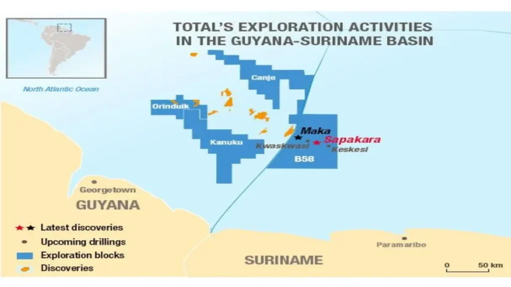 Guyana-Suriname Basin exploration map, showing Block 58 (GranMorgu – Sapakara/Krabdagu), recent discoveries, and cross-border potential with Guyana.