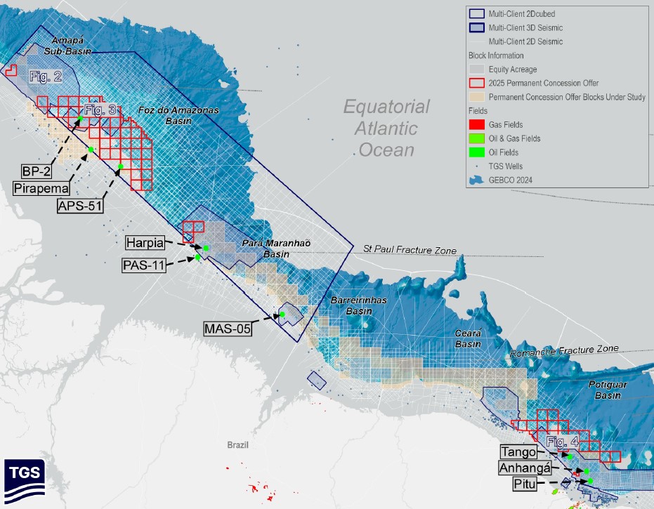 Brazil Equatorial Margin seismic coverage and block map, showing Foz do Amazon as, Pará-Maranhão, Barreirinhas, Ceará, and Potiguar basins with recent acreage on offer.