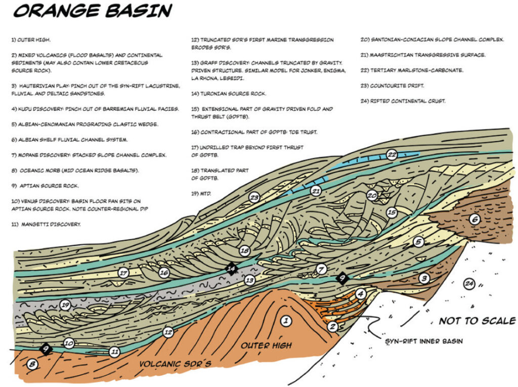 Geological cross-section of the Orange Basin, illustrating key plays from Aptian source rocks through Albian-Cenomanian channels, slope fans, and structural traps (Venus and Mopane-style plays highlighted).