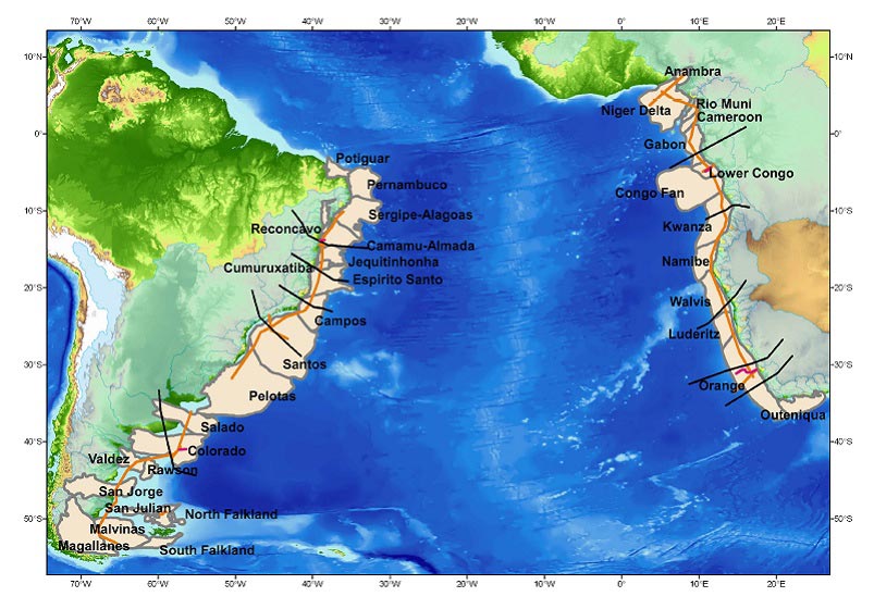 Overview of the Equatorial Margin and conjugate Atlantic basins, showing the geological link between the South American and African margins (from Brazil pre-salt to Namibia Orange Basin and beyond).