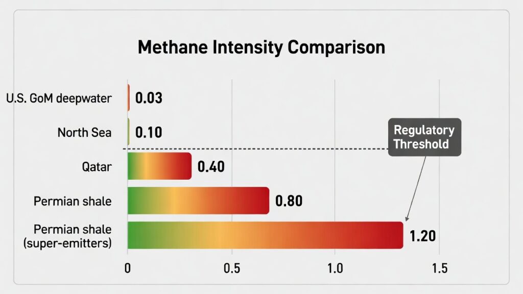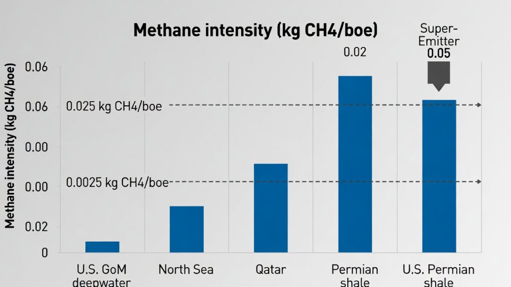 (image: Line/bar chart comparing methane intensity (kg CH₄/boe) across major basins: U.S. GoM deepwater, North Sea, Qatar, Permian shale, with regulatory thresholds marked and super-emitter outliers highlighted.)