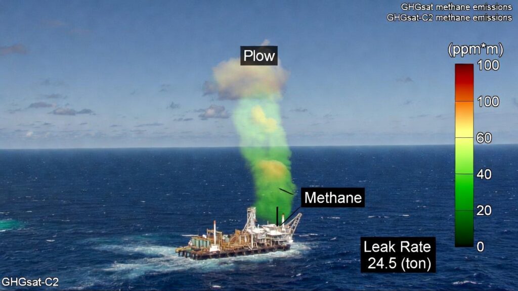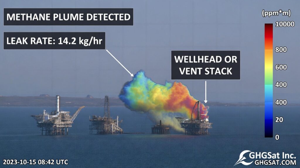 ( image: Annotated satellite image showing a methane plume over an offshore platform, with concentration scale, detected leak rate, and attribution to a specific wellhead or vent stack.)