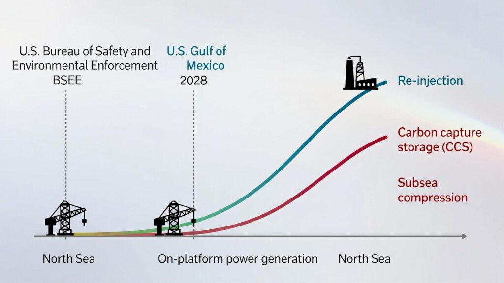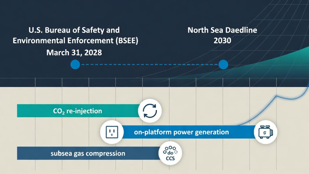 ( image: Timeline infographic showing regulatory deadlines (U.S. BSEE 2028, North Sea 2030) and alternatives (re-injection, on-platform power, CCS, subsea compression) with icons and adoption curves.)