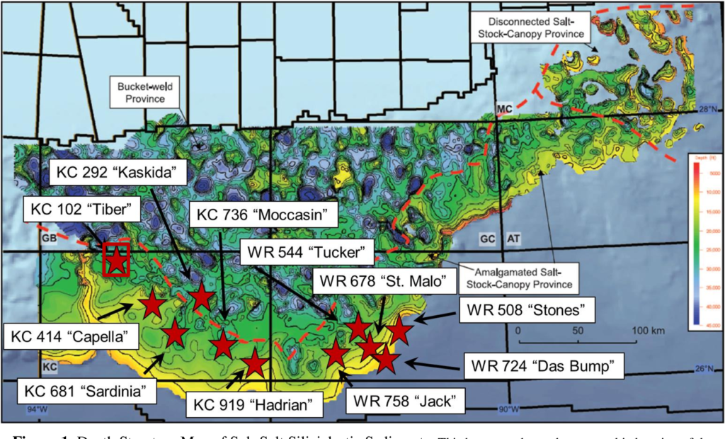 Visual: Keathley Canyon / Tiber field regional map – Bathymetry and structural overview showing Tiber (KC 102), nearby Kaskida, and Paleogene prospects—highlights ultra-deep salt/salt tectonics context.