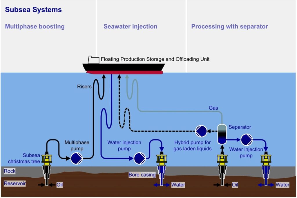 Visual: Another subsea systems infographic – Shows floating production unit connections, multiphase boosting, injection, and processing—mirrors setups in Gorgon brownfield or Tiber deepwater.