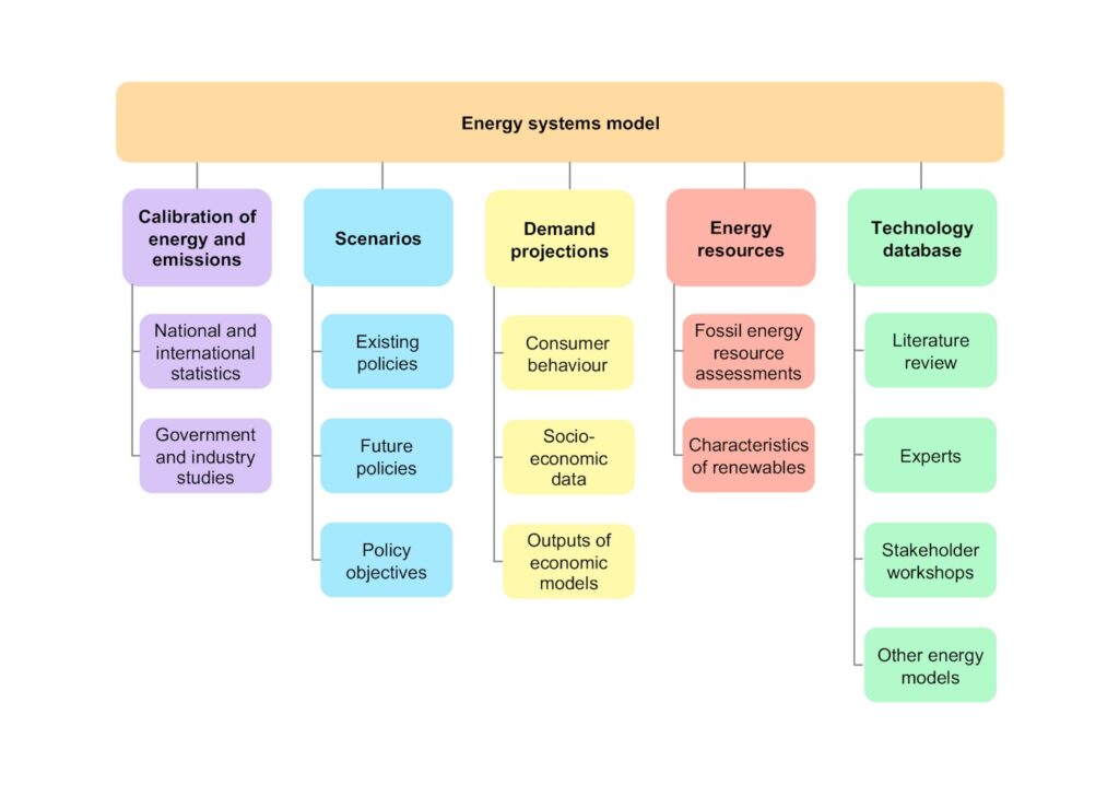 (Above: IEA energy systems model diagram showing integration of data sources, scenarios, demand projections, energy resources, and technology databases for forecasting and policy influence.)